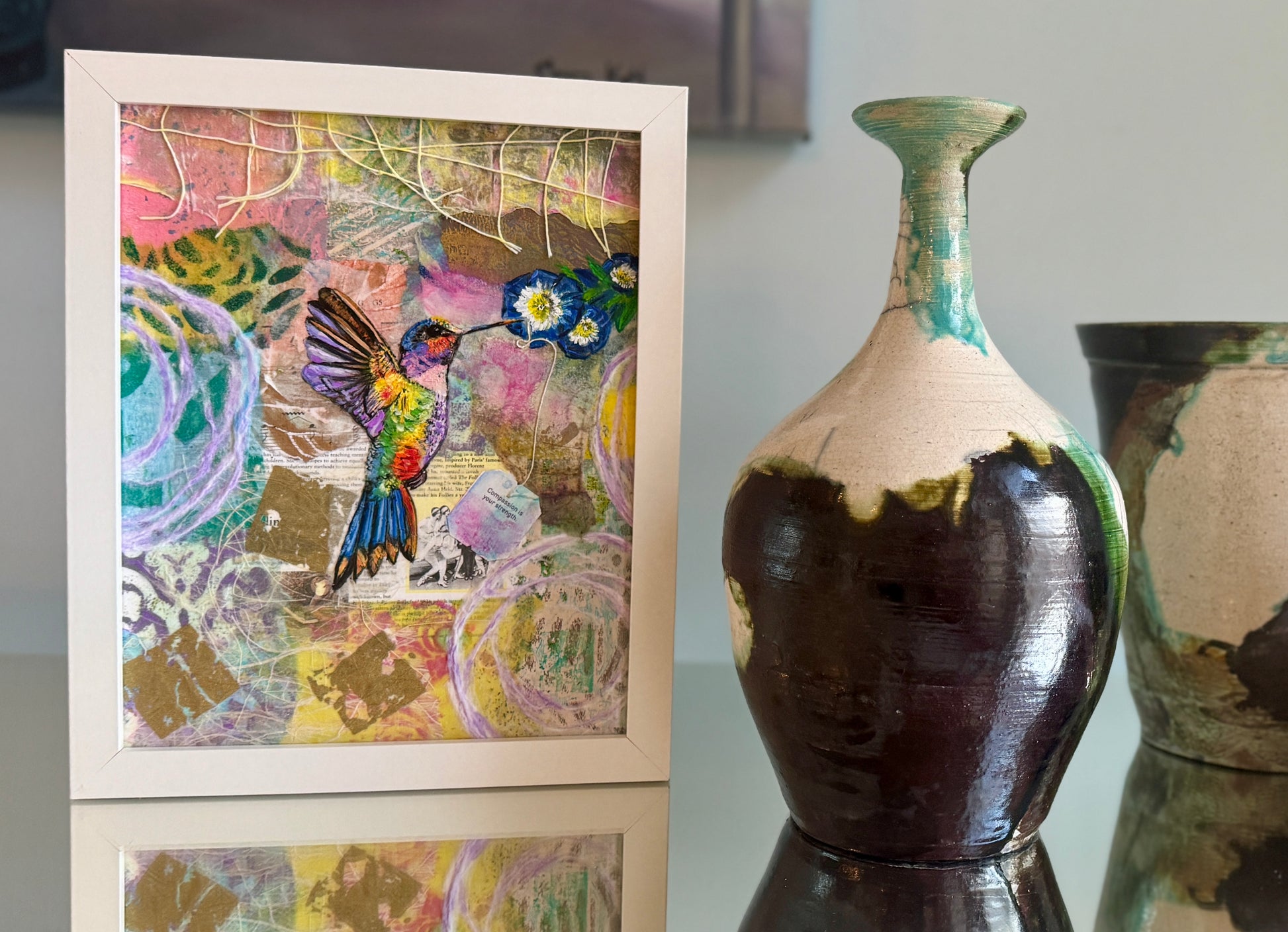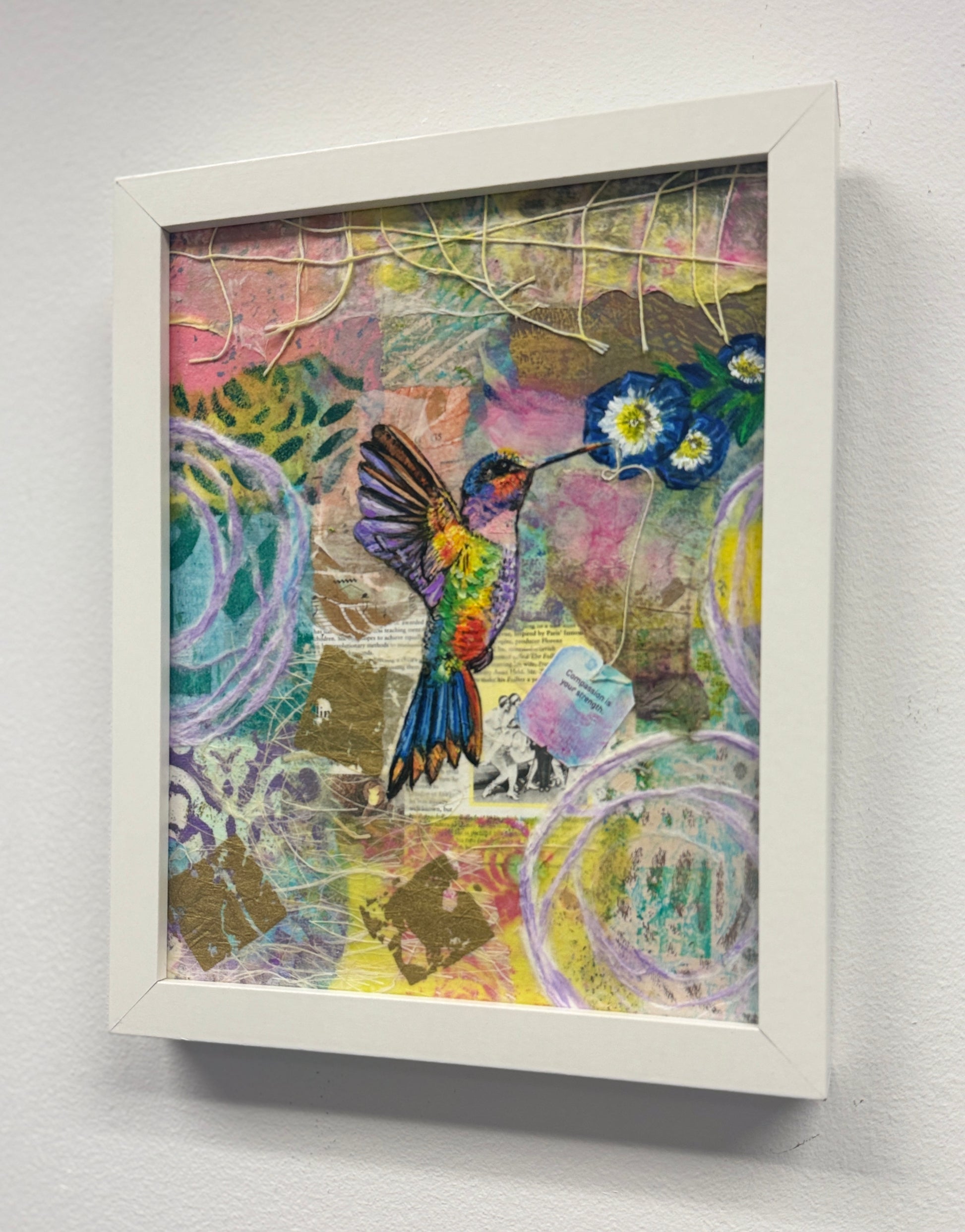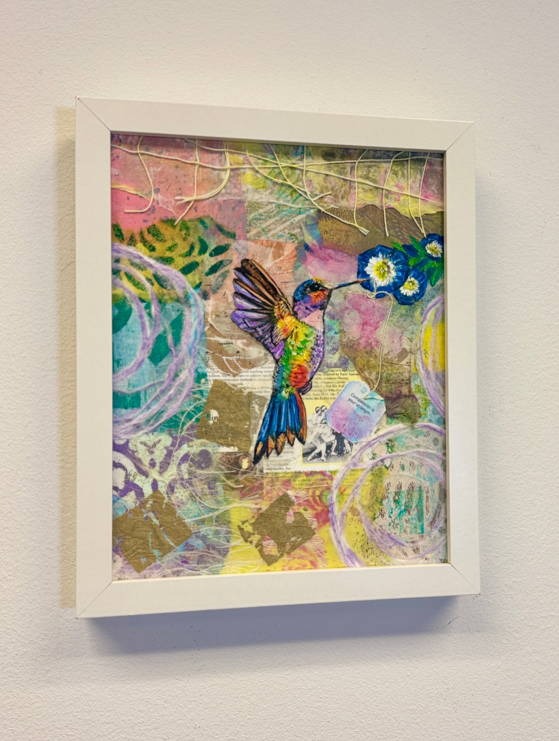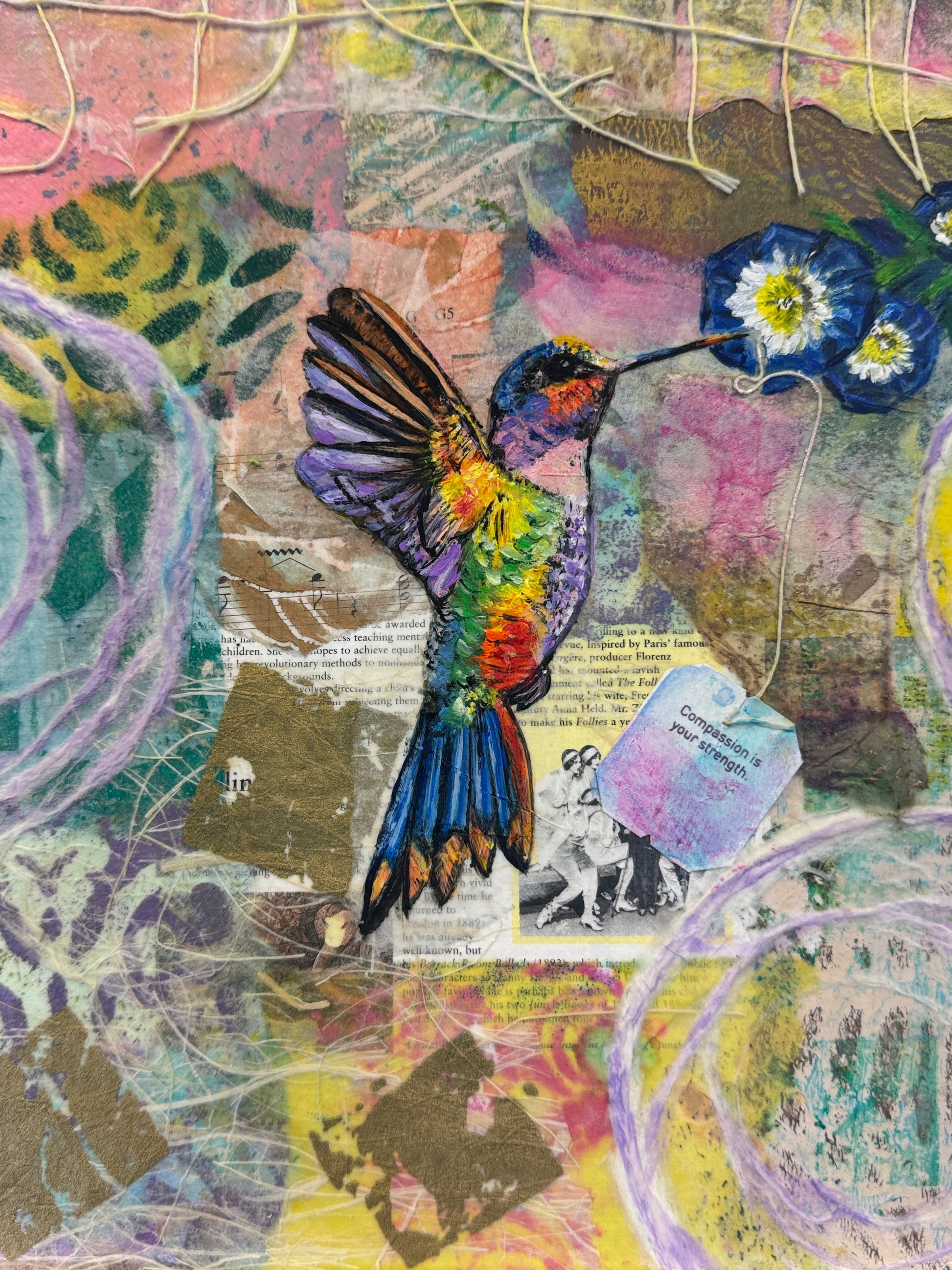 "Compassion" brings together acrylic painting and mixed media techniques in a striking composition. A gracefully rendered hummingbird takes center stage, painted by hand and positioned within an intricate collage of textured elements. The foundation features hand-painted papers, gel-printed details, and woven fibers that create visual and tactile depth. This layered approach transforms the piece into a multidimensional work that rewards both distant viewing and close inspection, while adding words of affirmation "Compassion is your strength".