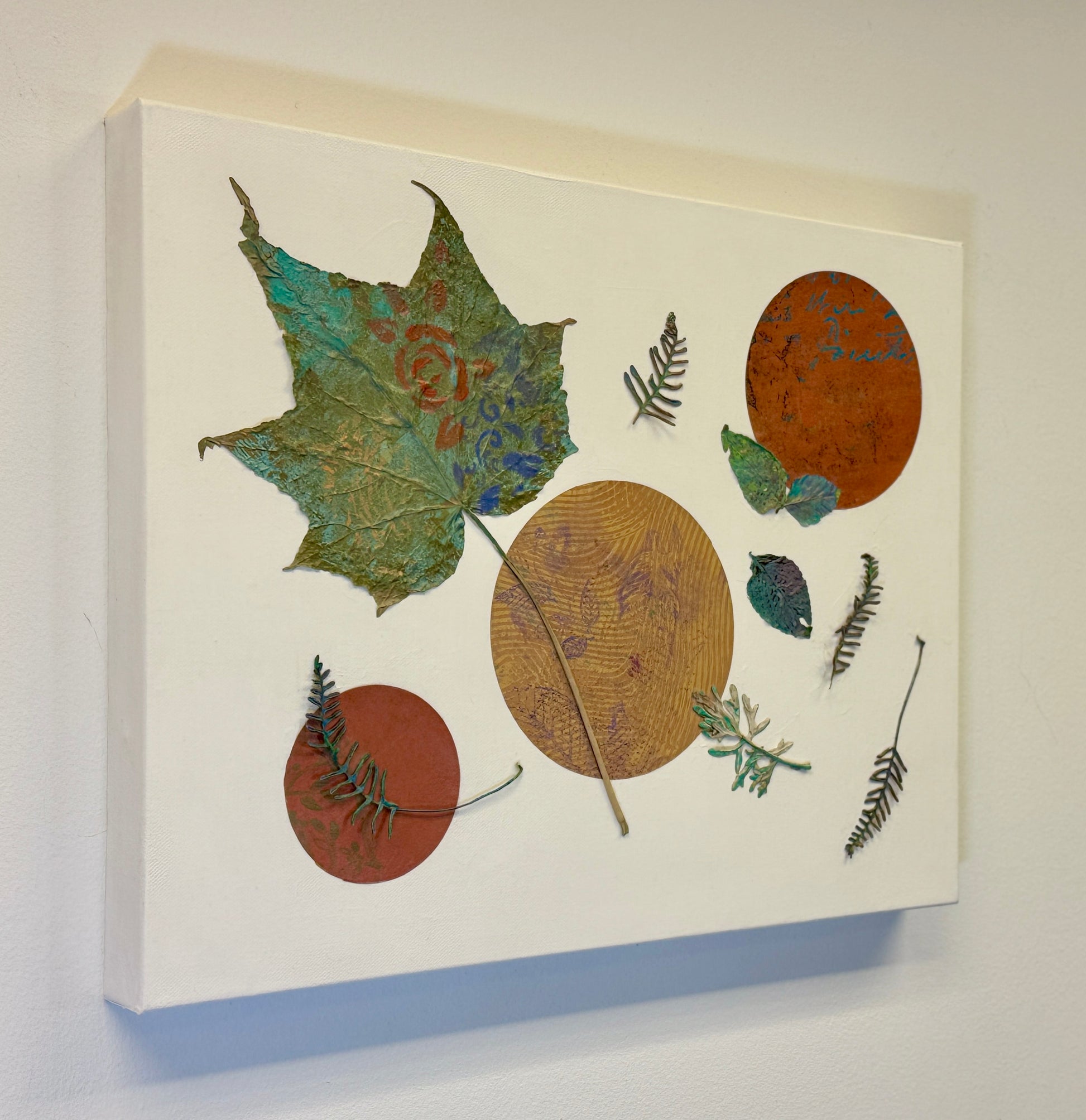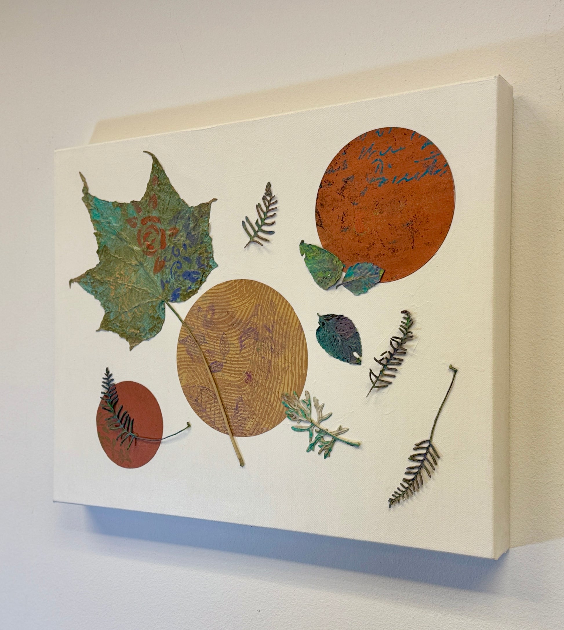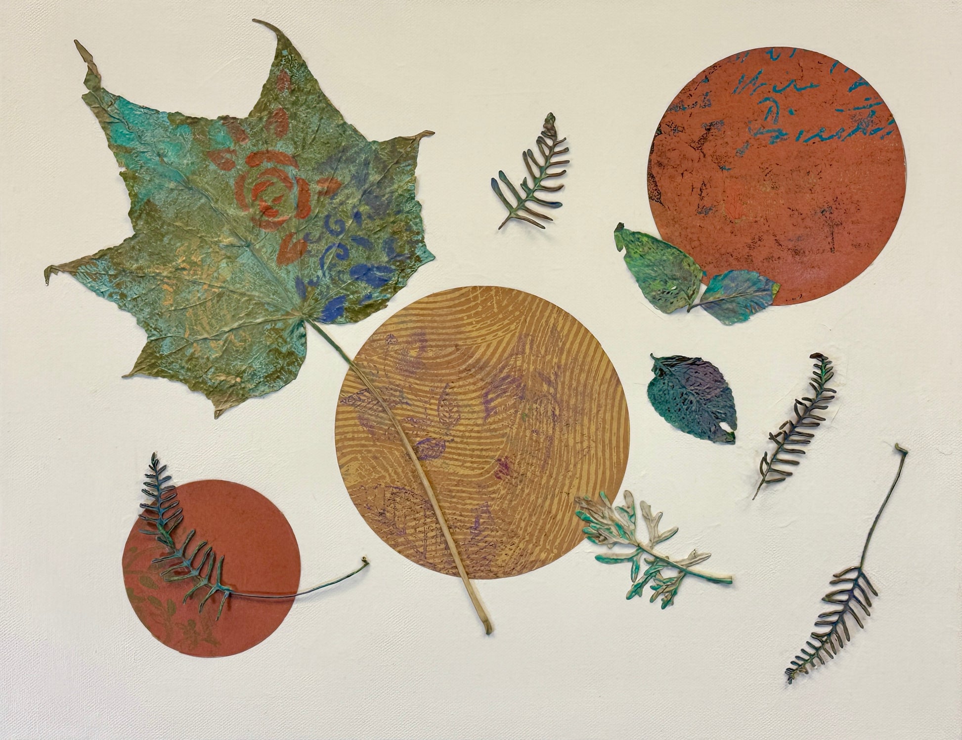 This mixed media collage celebrates the season with genuine leaves transformed through gel printing techniques. Vibrant, hand-painted papers were carefully cut into circles, each one showcasing the unique patterns created during the printing process. The result is a thoughtfully composed piece that brings together natural elements and artistic experimentation, creating a warm and inviting visual statement perfect for embracing autumn's beauty.