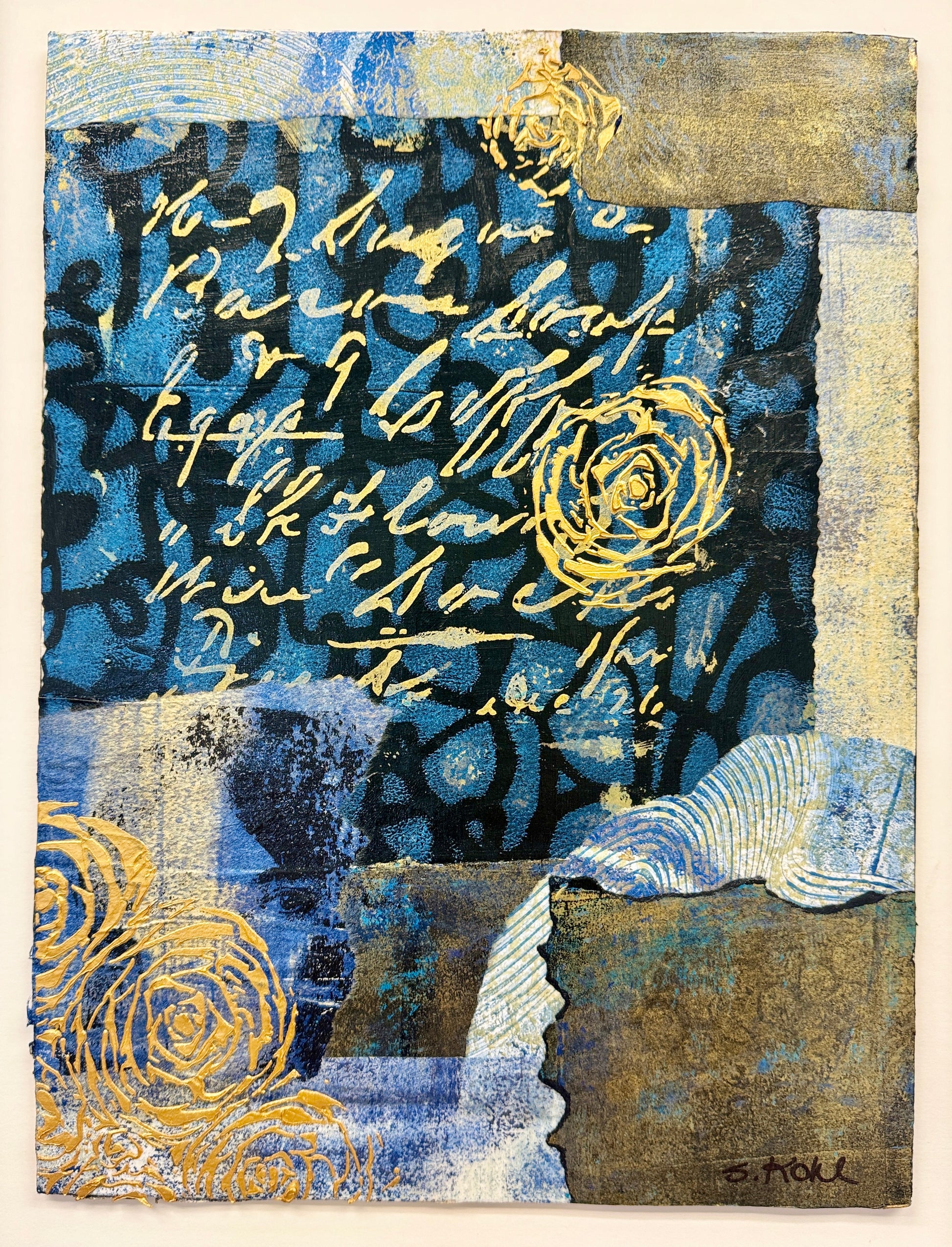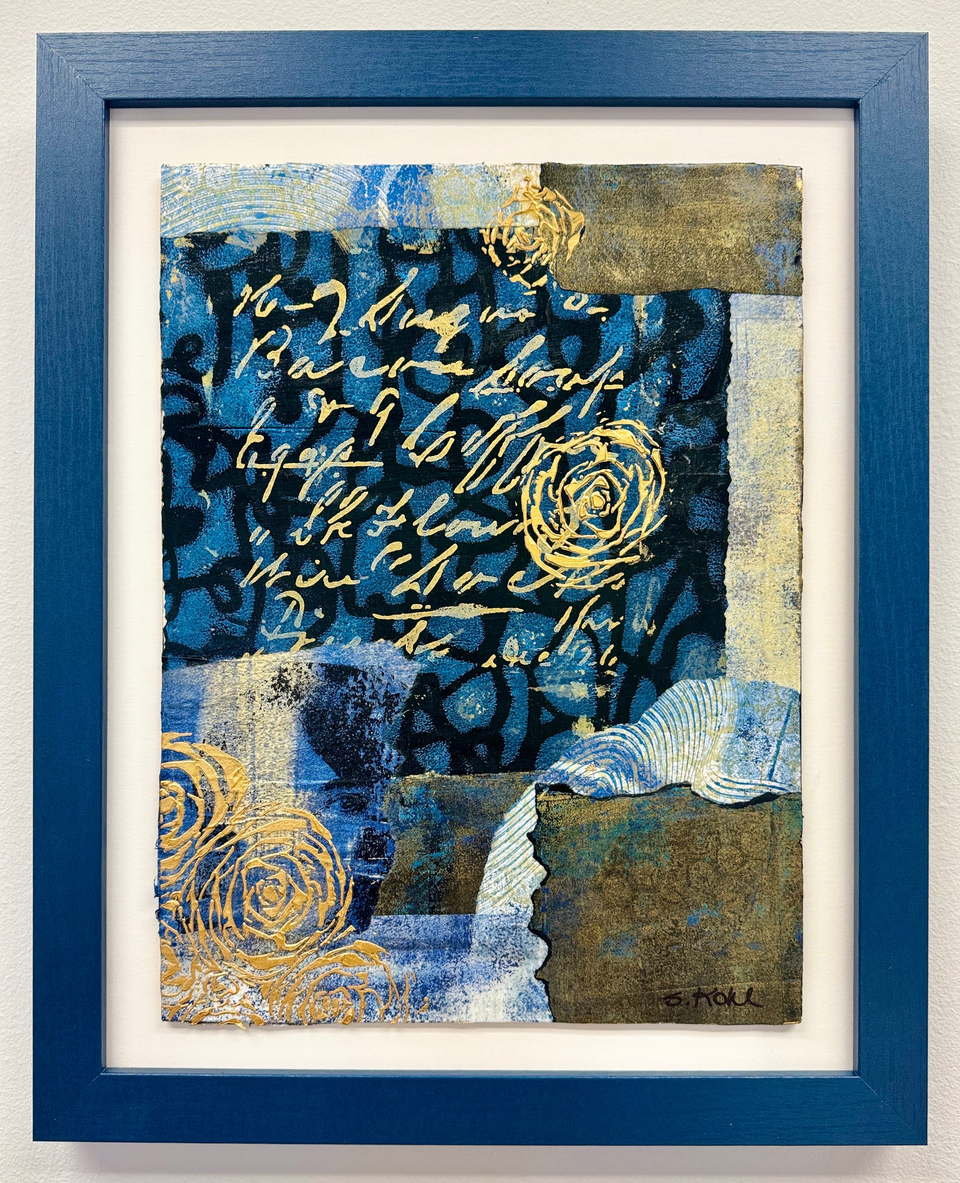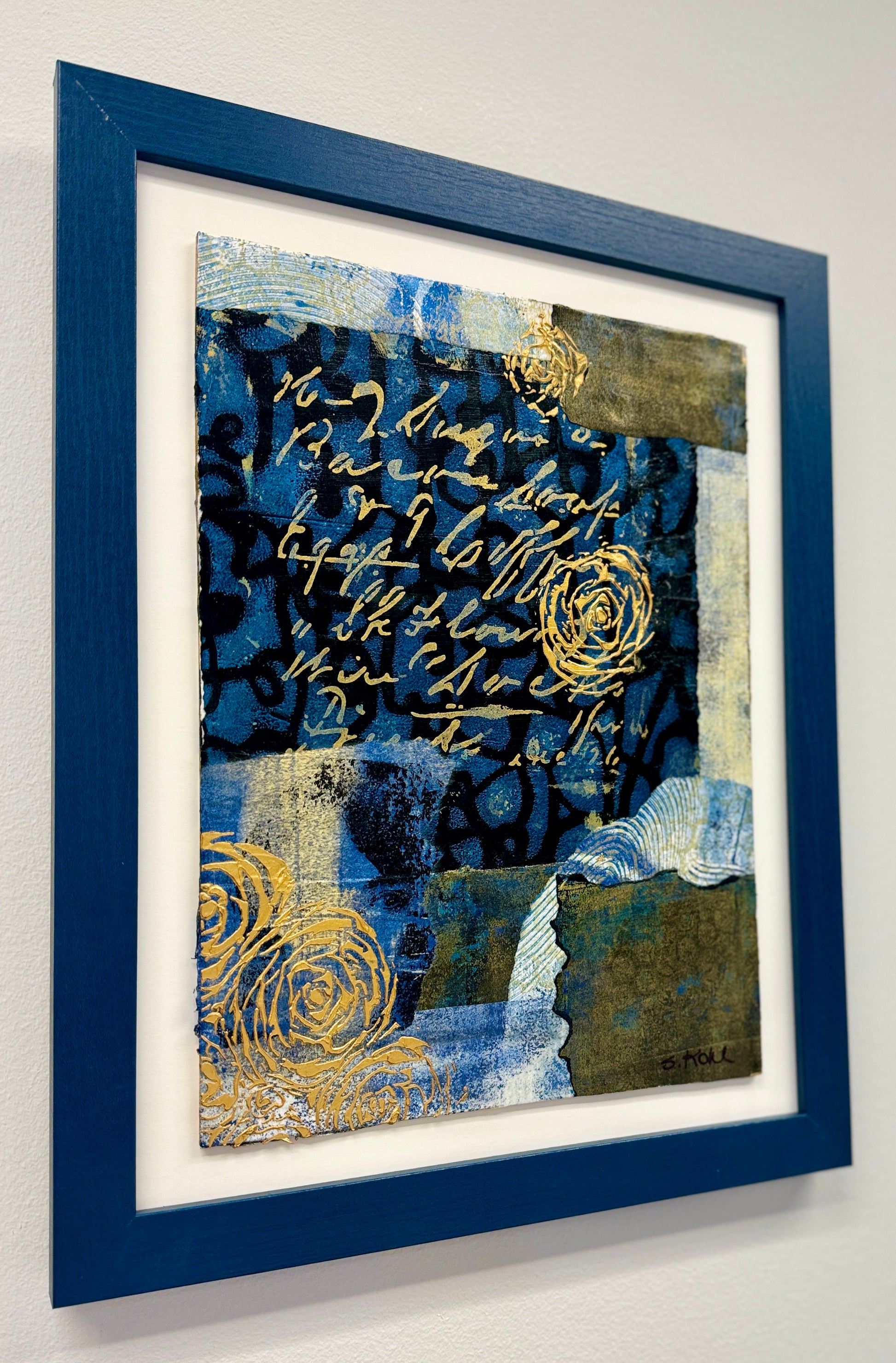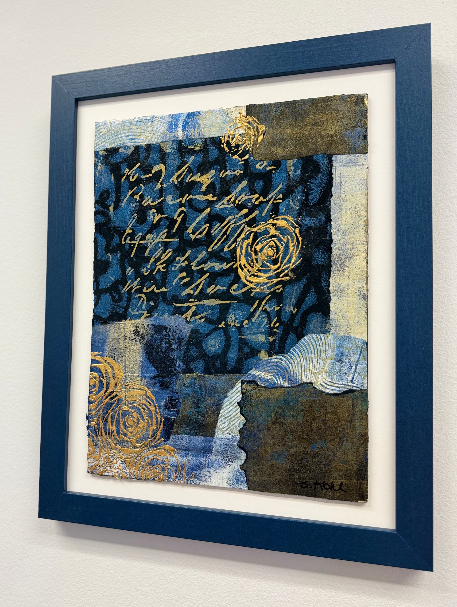 The "Just Add Water" abstract Collage is made with a combination of acrylics, alcohol inks, and uniquely crafted gel-printed and hand-painted papers. It features a sculptural relief and is mounted on a matte and framed without glass for a truly one-of-a-kind art piece.