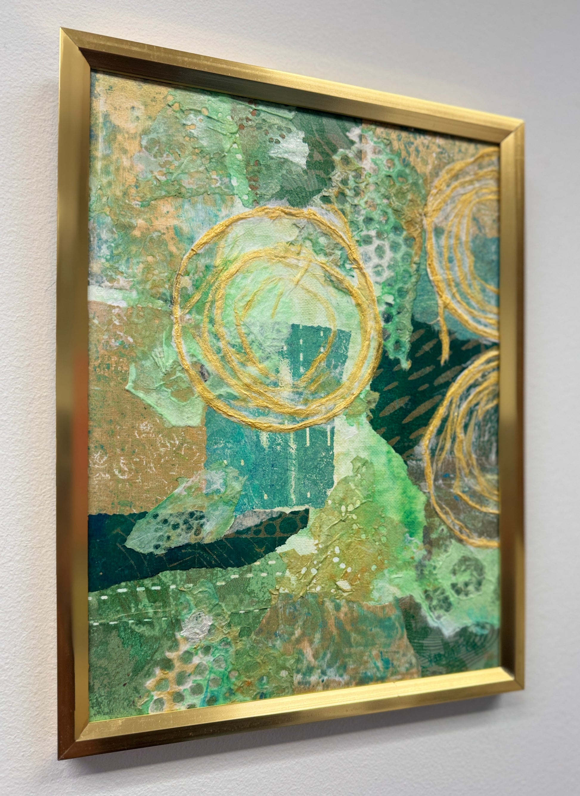 "Midas Touch I " This mixed media collage art piece features a blend of hand-painted papers, gel prints, and various fibers, all enhanced with vibrant acrylics. It's a stunning and one-of-a-kind work of art that will add a touch of sophistication to any home decor. This piece has a companion piece 'Midas Touch II'