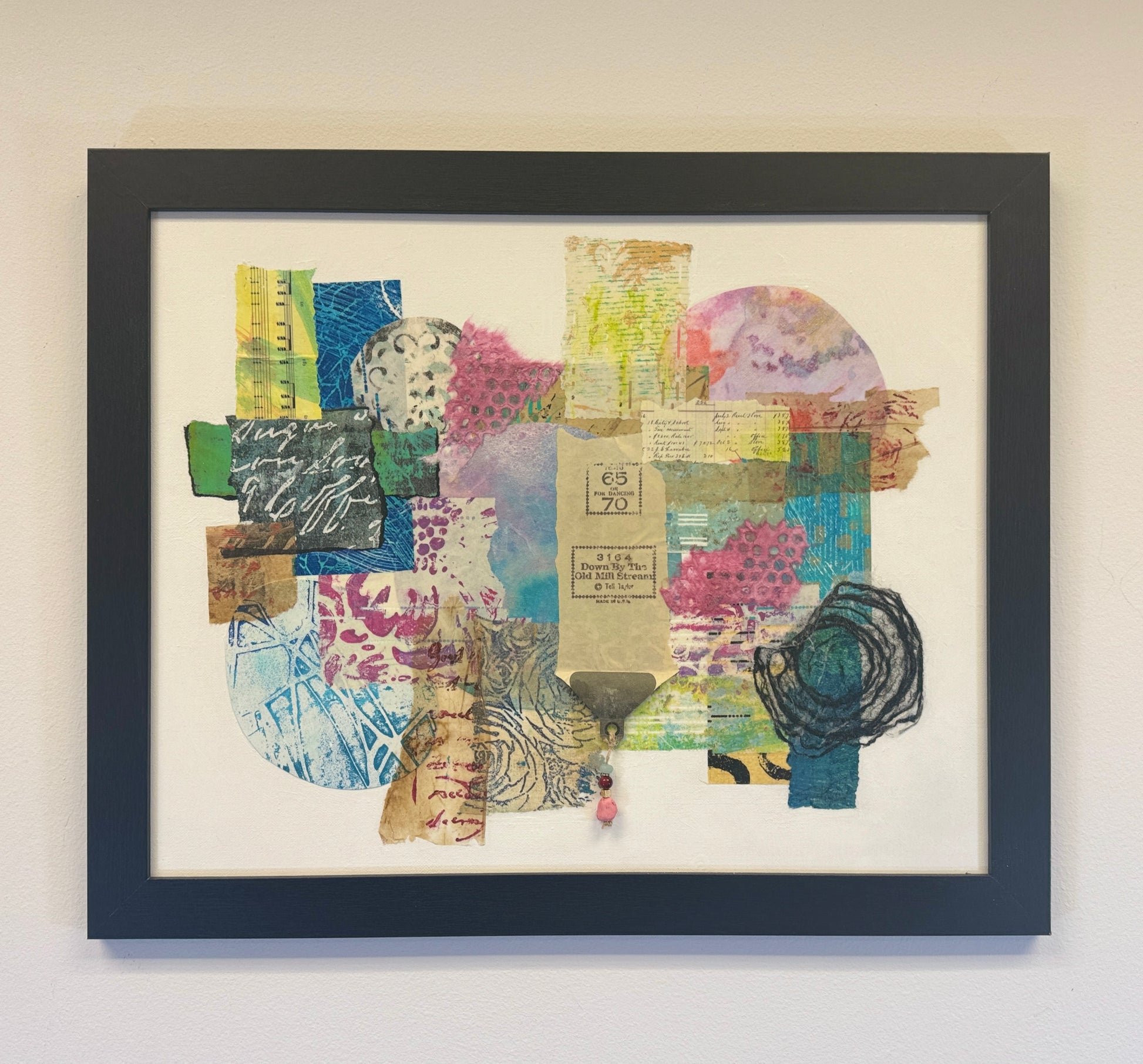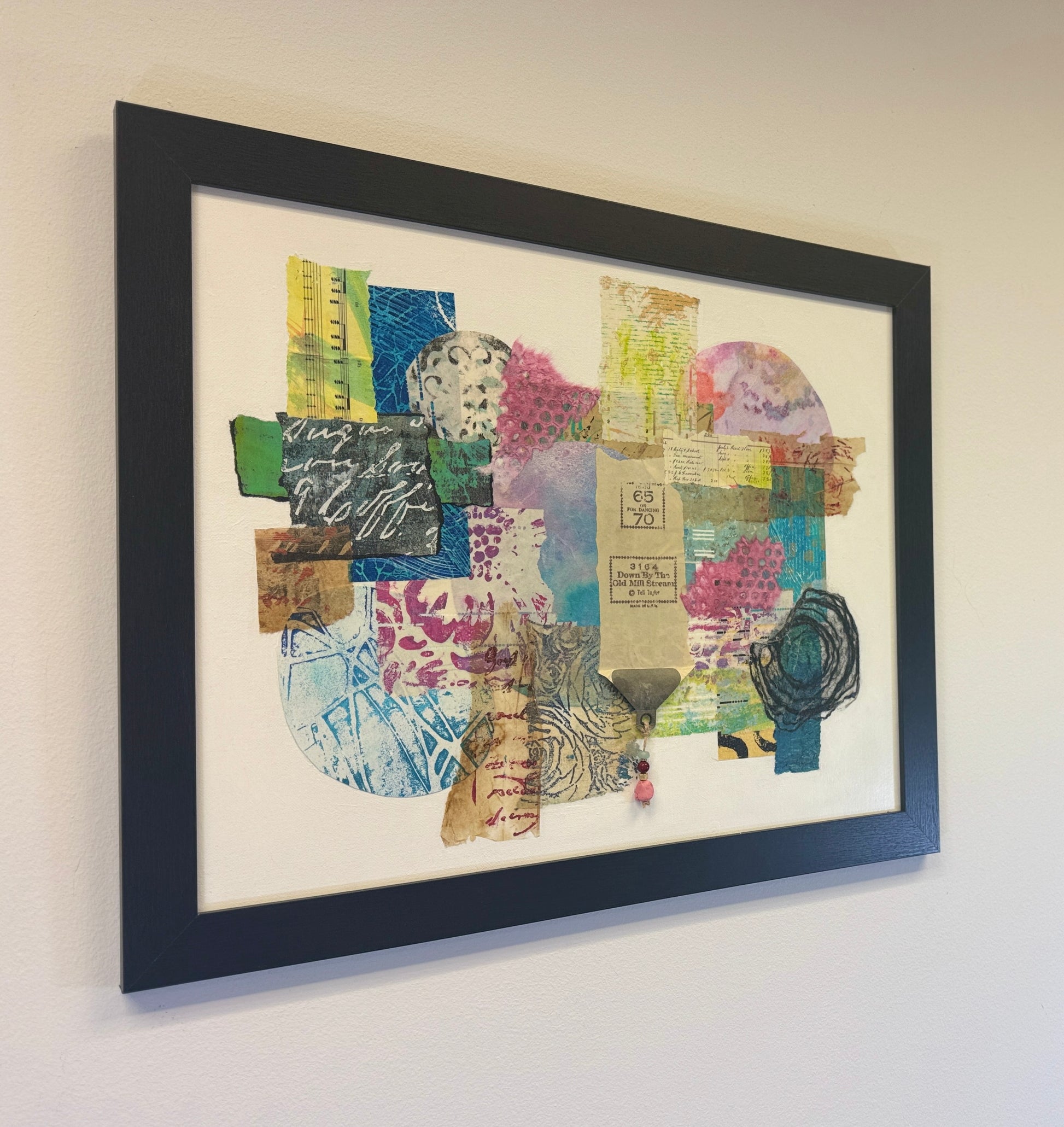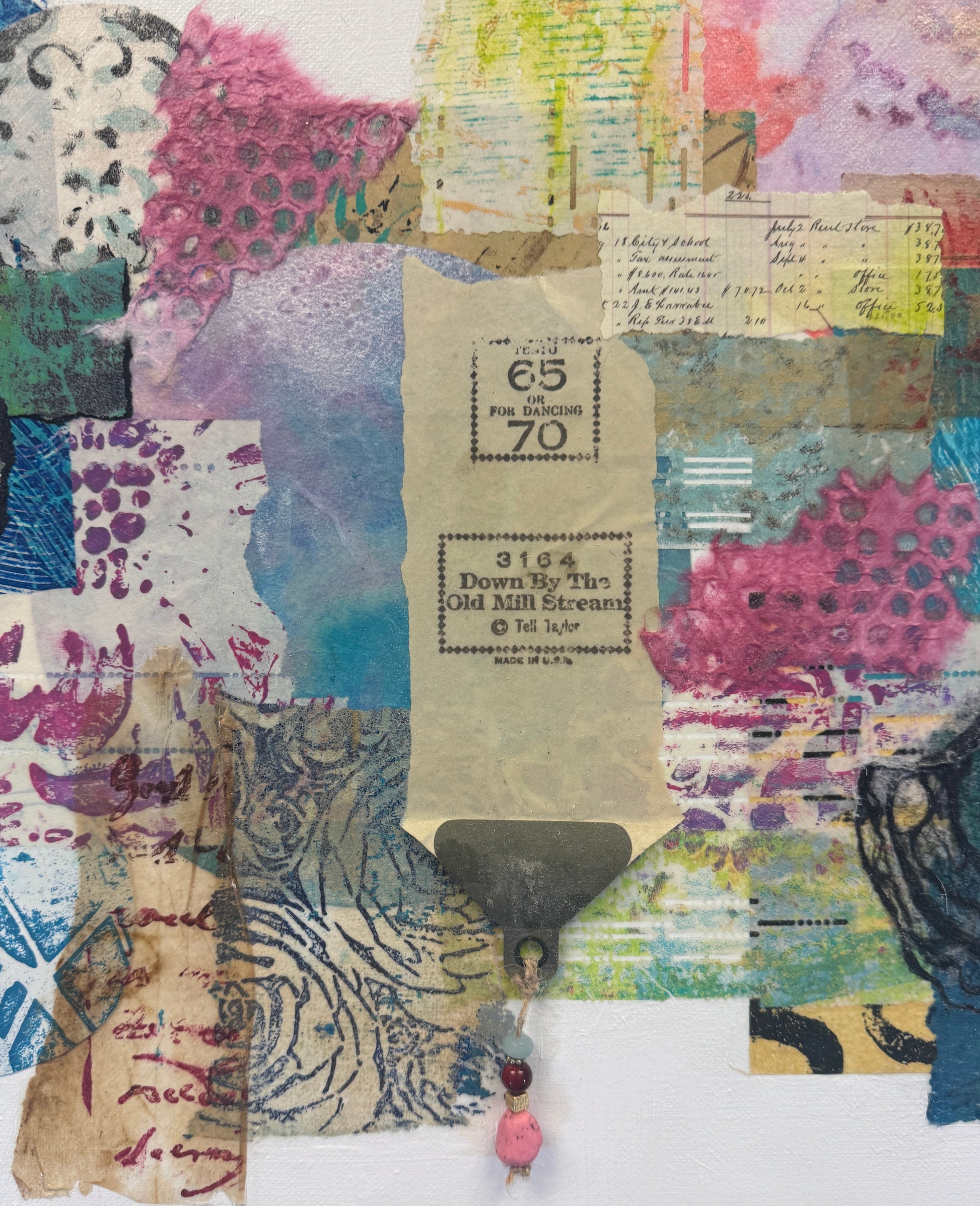 "Tempo 65" is a mixed media artwork made from hand-painted and gel-printed papers. It incorporates QRS player piano papers in the collage, including paper from the song "Down by the Old Mill Stream." Beads hanging from the grommet create a three-dimensional effect. This abstract piece brings a vibrant burst of color to any decor and can be displayed alone or with its two companion pieces.