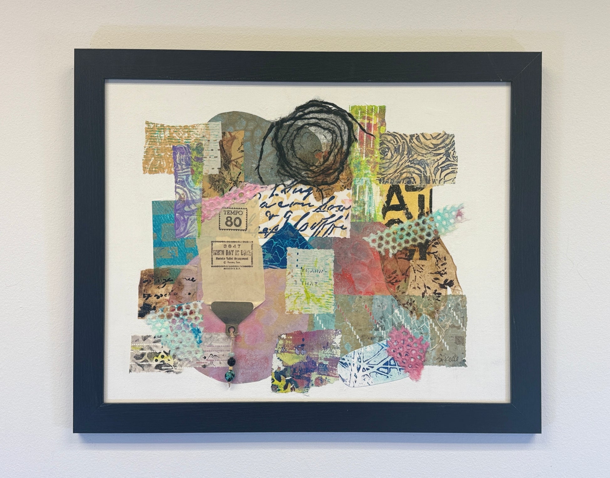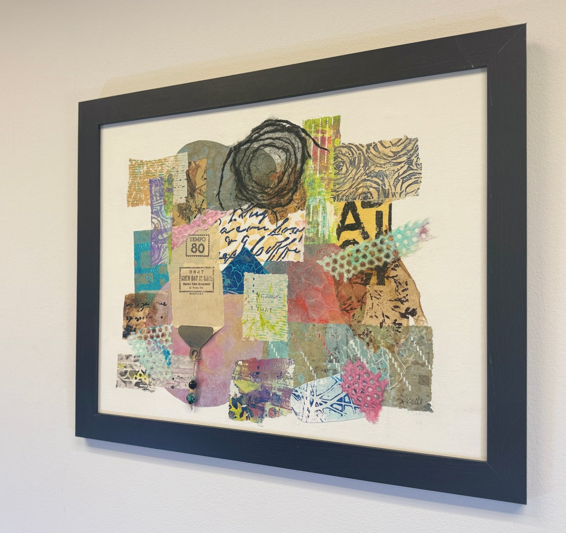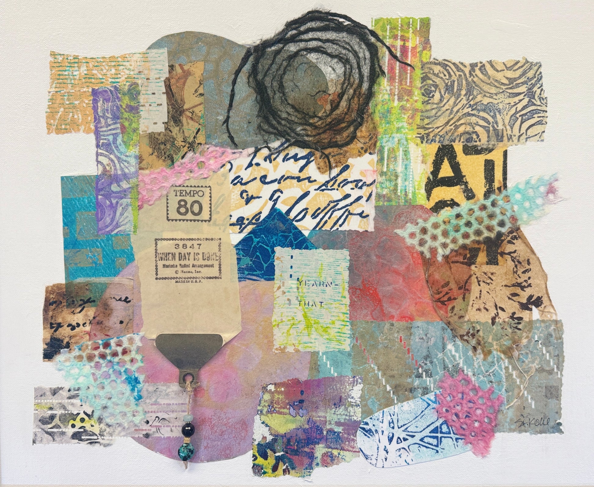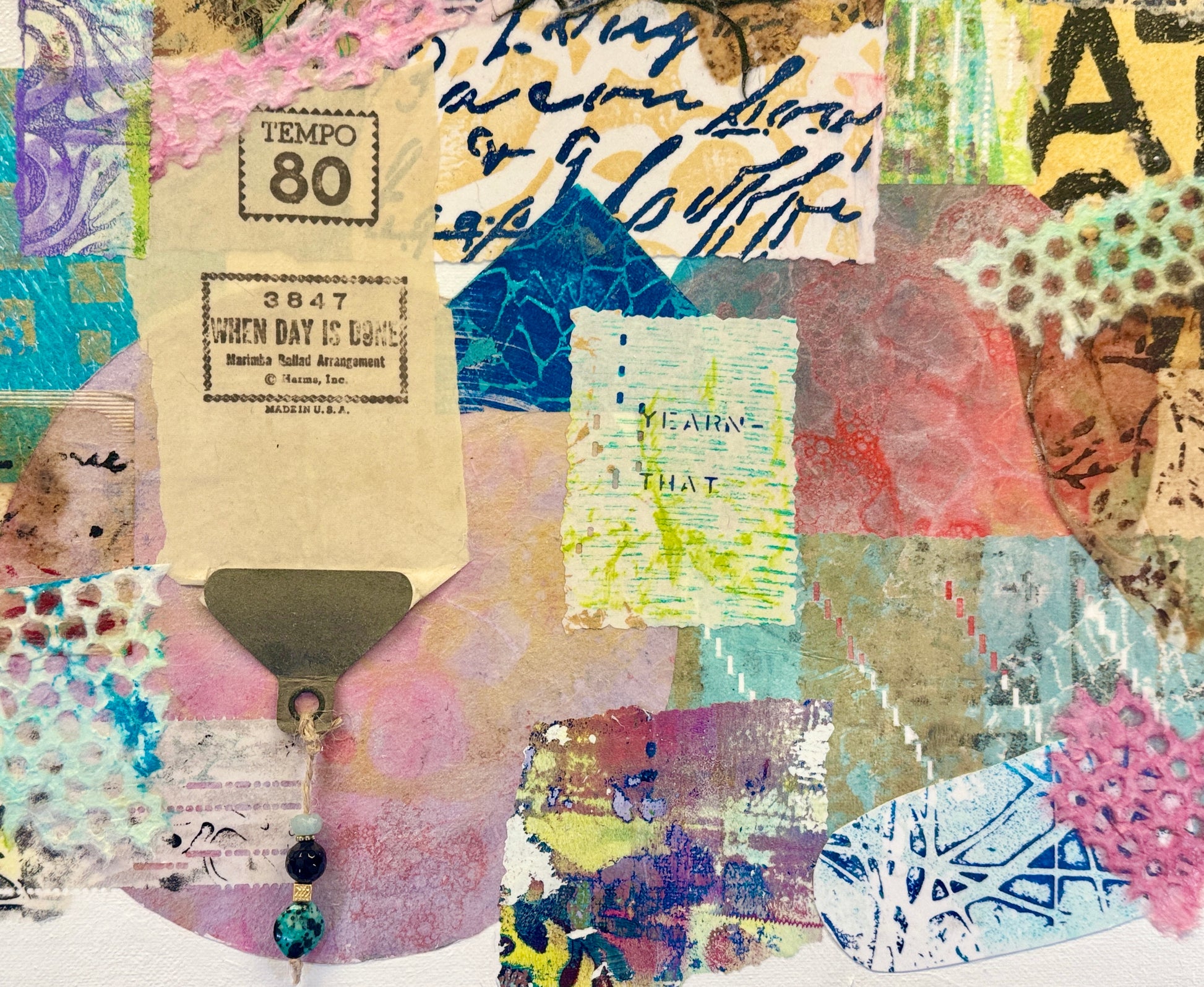 "Tempo 80" is a mixed media artwork made from hand-painted and gel-printed papers. It incorporates QRS player piano papers in the collage, including paper from the song "When the Day is Done." Beads hanging from the grommet create a three-dimensional effect. This abstract piece brings a vibrant burst of color to any decor and can be displayed alone or with its two companion pieces.