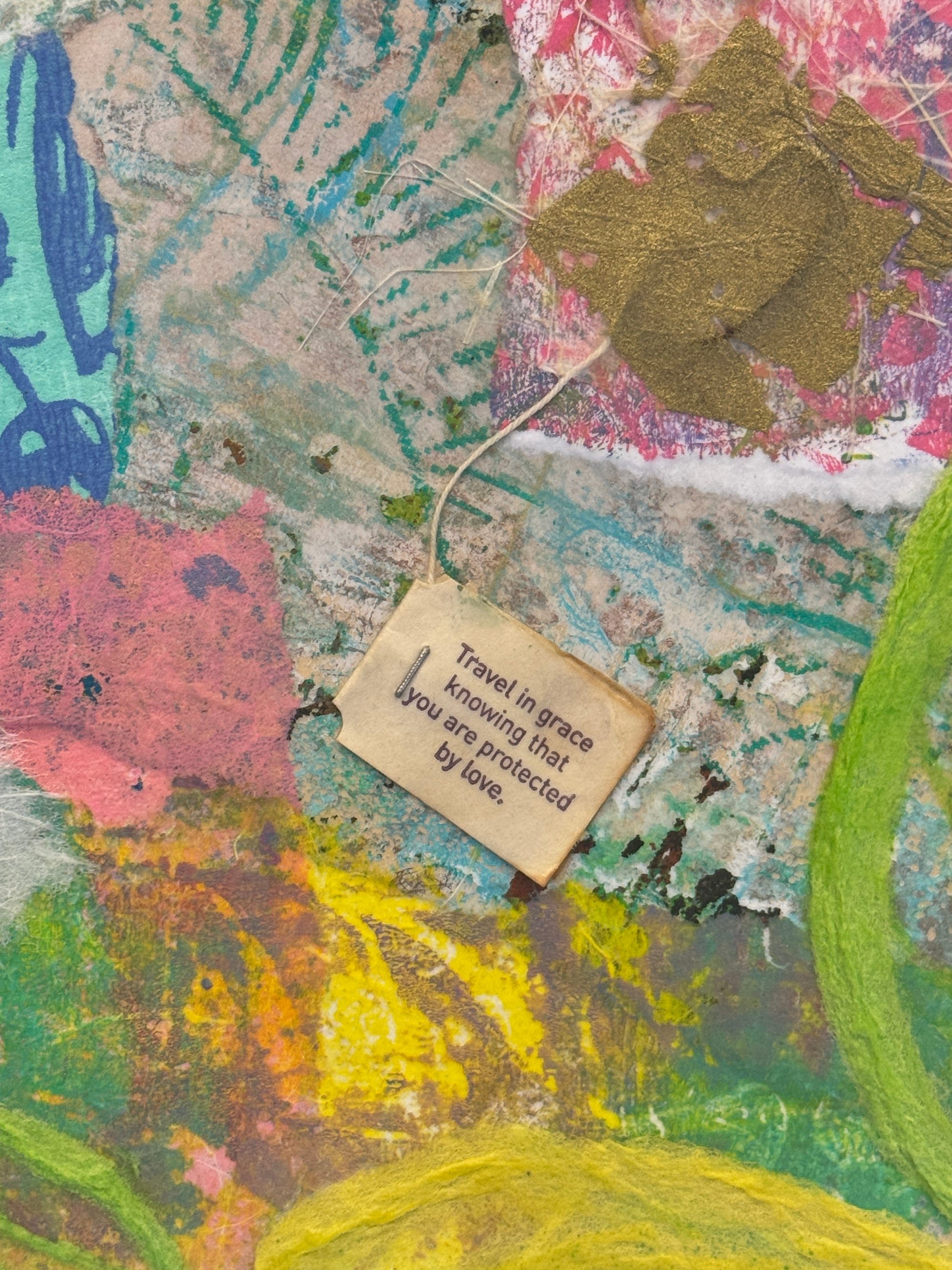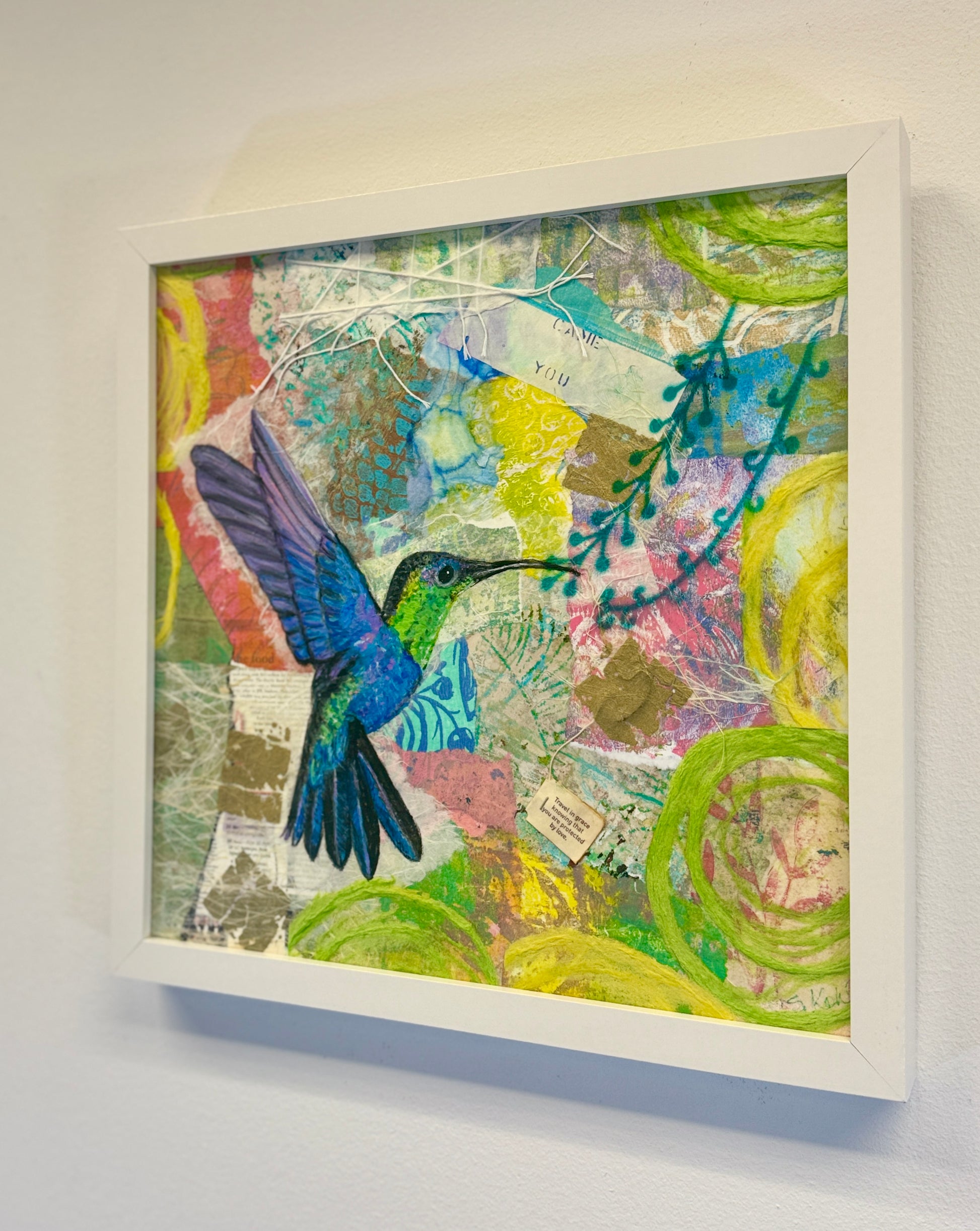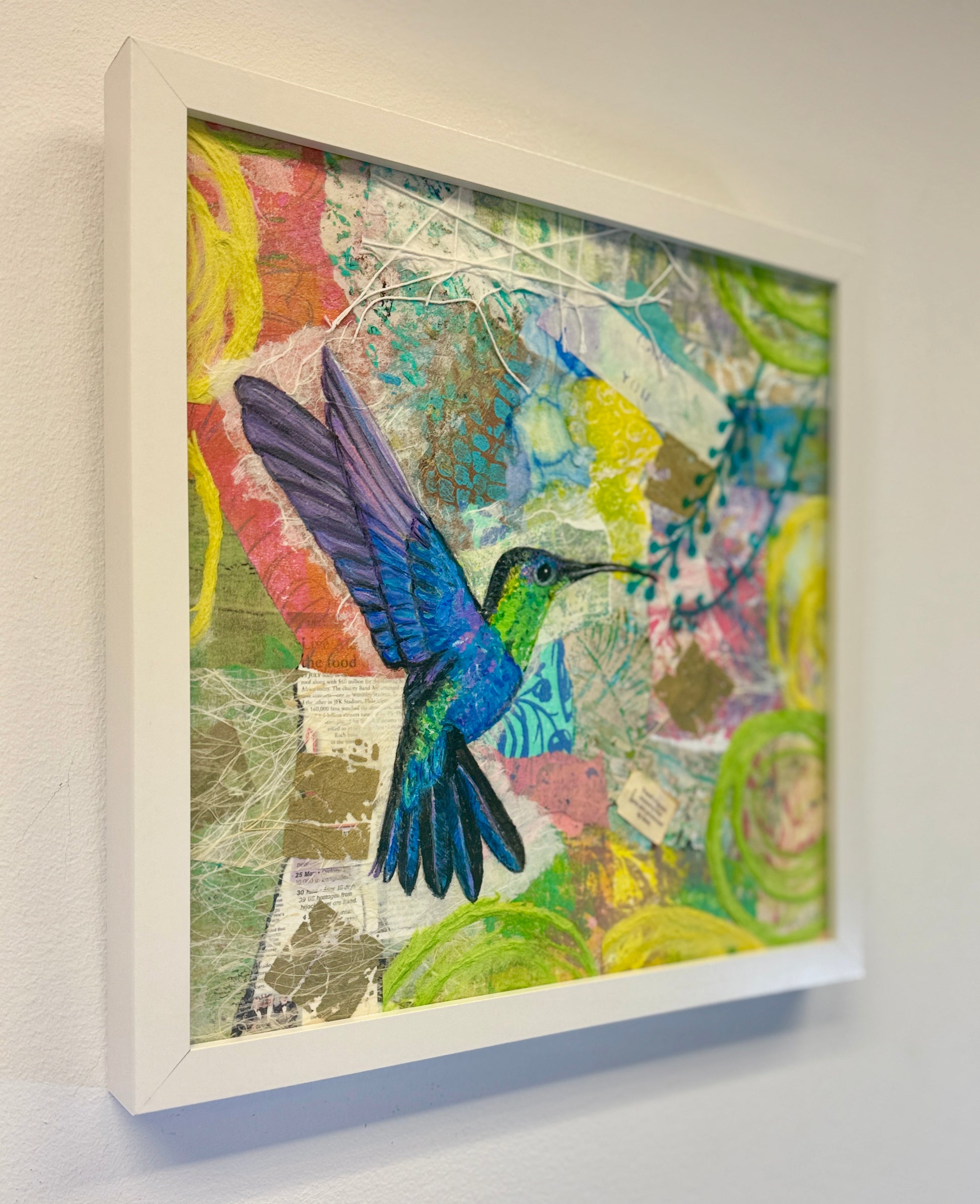 "Travel in Grace" is a captivating mixed media art piece that combines hand-painted and gel-printed papers to create a unique visual experience. The artist skillfully integrates various fibers, adding a rich texture that invites close inspection and tactile appreciation. At the heart of the composition, a delicately hand-painted hummingbird brings life and movement to the work, symbolizing freedom and beauty. Vibrant colors brighten any space, making this artwork a meaningful and uplifting addition to your decor. Let "Travel in Grace" inspire a sense of peace and gentle strength wherever it is displayed.